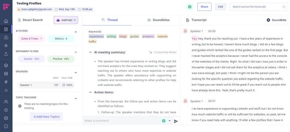 Fireflies.ai es un software asistente durante las reuniones con inteligencia artificial, está diseñado para tomar notas y transcribir voces en tiempo real. Ya sea durante una sesión con tu equipo o en una llamada con un cliente, Fireflies convierte instantáneamente las conversaciones en texto escrito. Capaz de captar con precisión distintos acentos, dialectos, contextos e idiomas, proporcionando transcripciones precisas desde el primer momento. La herramienta Fireflies mejora la productividad y la precisión al documentar sus reuniones, haciendo más fáciles de gestionar y colaborar en equipo. Fireflies.ai le ayudará a transcribir, resumir, buscar y analizar conversaciones de voz. Cargue archivos de audio, capture reuniones en persona y transcriba llamadas telefónicas.