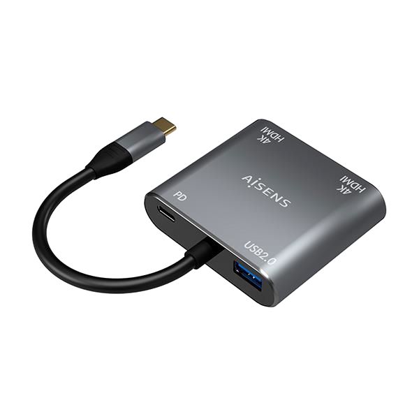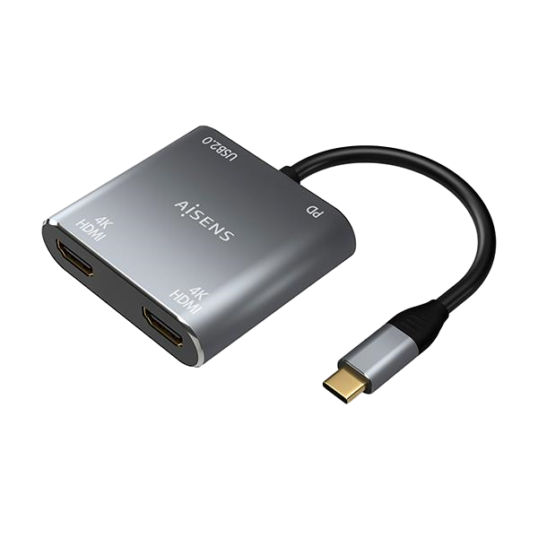 Aisens A109-0625 2x HDMI 4K USB-C – Adaptador USB. Conversor USB-C a 2xHDMI 4K SST MST/USB2.0/USB-C PD 60W, con conector USB Tipo-C macho en un extremo y 2xHDMI 4K@30Hz hembra, USB 2.0 hembra y USB-C hembra en el otro. Se permite utilizar los 4 puertos (2xHDMI, USB2.0 y USB-C) a la vez. El puerto HDMI soporta la resolución máxima 4Kx2K@60Hz (1 monitor) o 4Kx2K@30Hz (2 monitores). El puerto USB 2.0 soporta la velocidad de transferencia de hasta 480Mbps