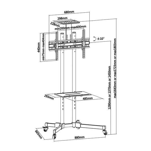El Aisens FT70TE-035 es un soporte de suelo inclinable diseñado para televisores y monitores de 37” a 70”, capaz de soportar hasta 50 kg con total seguridad. Fabricado en acero de alta resistencia y recubierto con pintura electrostática, combina robustez y estilo, garantizando un acabado elegante y duradero. El diseño permite colocar televisores de gran tamaño de forma estable, ofreciendo una solución completa para salones, oficinas o espacios profesionales donde la movilidad y estabilidad son clave. Este soporte incorpora ruedas integradas que facilitan la movilidad, permitiendo mover el televisor sin esfuerzo de un lugar a otro. Además, cuenta con una bandeja para DVD de 293 x 485 mm y un soporte de cámara de 228 x 298 mm, ambos con altura ajustable, ofreciendo un espacio práctico para tus dispositivos multimedia y accesorios de forma organizada y accesible. El rango de ajuste de las ruedas, de 665 x 880 mm, asegura una máxima estabilidad y facilidad de transporte.