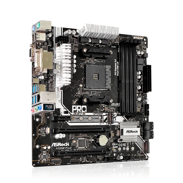 La placa base Asrock A320M PRO4 tiene todas las prestaciones de una placa ATX en su tamaño reducido micro ATX, ya que cuenta con 4 bancos de RAM, y 2 puertos PCIe x16. Además, gracias a sus 3 salidas de video (D-Sub, DVI-D y HDMI), soporta hasta 3 monitores simultáneos utilizando la propia gráfica de la APU.