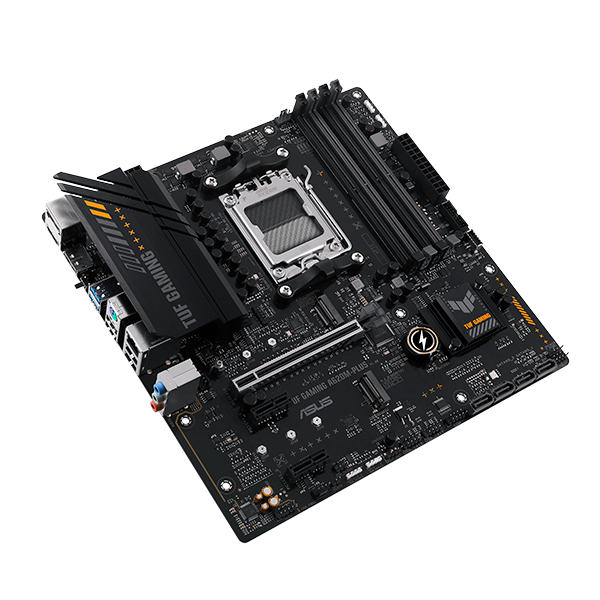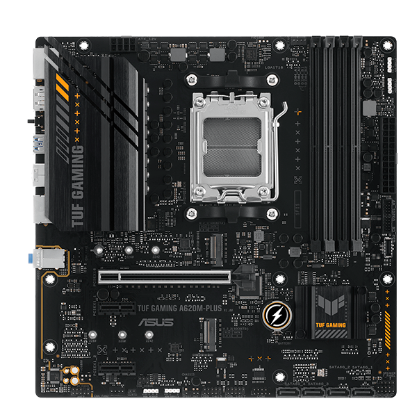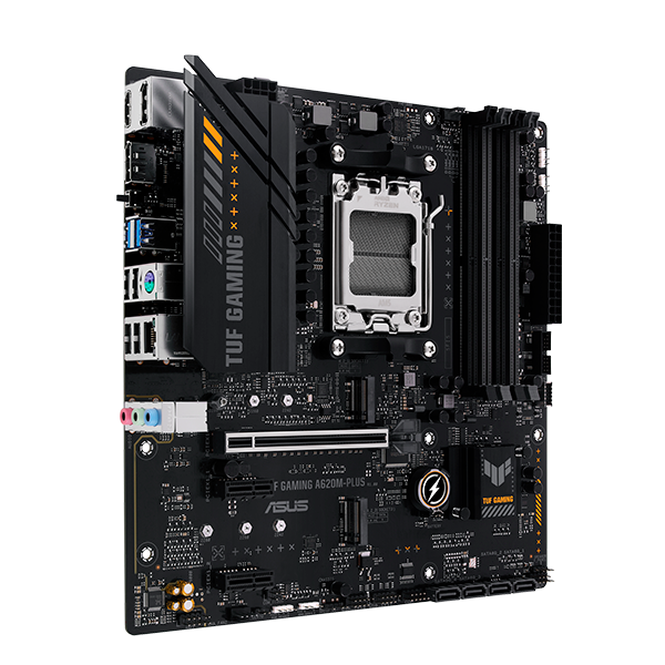 Asus TUF Gaming A620M-Plus | DDR5 | MicroATX – Placa Base AM5. El ASUS TUF GAMING A620M-PLUS se basa en el chipset AMD A620 y es compatible con procesadores AMD para el zócalo AM5. Tiene cuatro ranuras DDR5 para hasta 128 GB de RAM. Otras características del ASUS TUF GAMING A620M-PLUS incluyen una ranura PCIe 4.0 x16 y dos ranuras PCIe 3.0 x1. Además, el ASUS TUF GAMING A620M-PLUS tiene sonido de 8 canales, una interfaz LAN de 2.5 Gigabit, cuatro puertos SATA3, dos puertos M.2 y varios puertos USB.