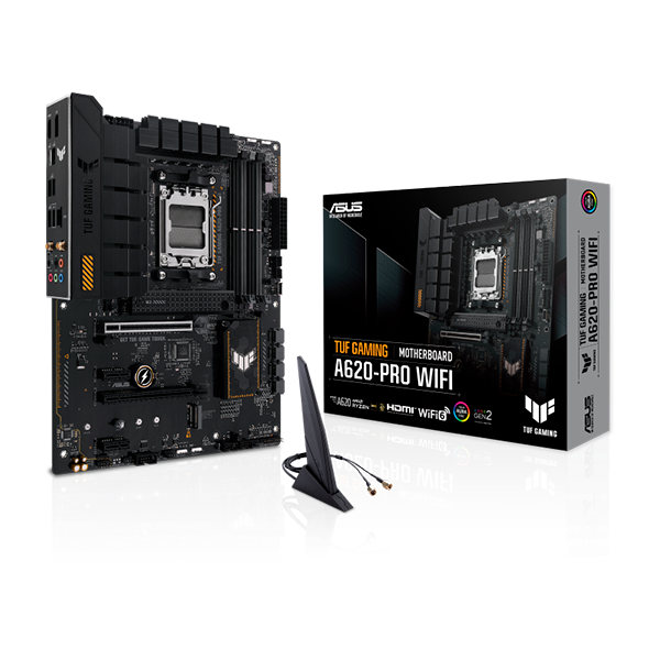 Asus TUF Gaming A620M-Pro | DDR5 | MicroATX | WiFi – Placa Base AM5. El ASUS TUF GAMING A620-PRO WIFI se basa en el chipset AMD A620 y es compatible con procesadores AMD para el zócalo AM5. Tiene cuatro ranuras DDR5 para hasta 128 GB de RAM. Otras características del ASUS TUF GAMING A620-PRO WIFI incluyen una ranura PCIe 4.0 x16, una ranura PCIe 3.0 x16 y dos ranuras PCIe 3.0 x1. Además, el ASUS TUF GAMING A620-PRO WIFI tiene sonido de 8 canales, una interfaz LAN Gigabit, cuatro puertos SATA3, dos puertos M.2, WiFi 6, Bluetooth 5.3 y varias interfaces USB.