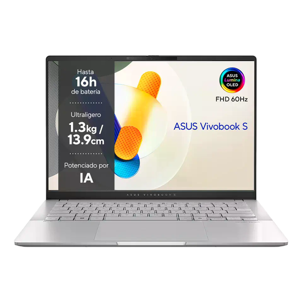 El ASUS Vivobook S 14 OLED M5406WA-QD088W es un portátil compacto y ligero de 14 pulgadas, diseñado para usuarios que buscan un equilibrio entre rendimiento, portabilidad y calidad de imagen. Presenta un acabado en color Cool Silver con chasis de aluminio y formato tipo concha. La pantalla WUXGA (1920 x 1200) con relación 16:10 utiliza tecnología OLED, ofreciendo negros profundos, colores intensos y una experiencia visual superior. El panel destaca por su calidad de imagen con 1,07 billones de colores, cobertura 100% DCI-P3, brillo típico de 400 cd/m² y hasta 600 cd/m² en HDR, junto con certificación DisplayHDR True Black 600 y un contraste de 1.000.000:1. Todo esto lo convierte en una excelente opción para consumo multimedia y tareas creativas, manteniendo una tasa de refresco de 60 Hz.