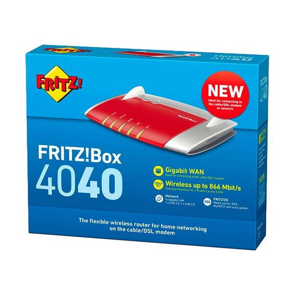Router WiFi dual banda AC + N (866 Mbps 5 GHz y 400 Mbps 2,4 GHz), Mesh, ampliación del alcance WiFi con la función de repetidor, máxima seguridad con WPA2 activado de fábrica, soporta WPS.Puerto WAN Gigabit, 4 x LAN Gigabit para conectar ordenadores y videoconsolas, 2 x USB (3.0 / 2.0) para impresoras, dispositivos de almacenamiento en red o conectar un módem USB 3G/4G, FRITZ!NAS. Servidor multimedia (UPnP AV), para compartir música, fotos y video en la red. Contenido de la caja: FRITZ!Box 4040, cable LAN de 1,8 m, fuente de alimentación, guía rápida de instalación en Español.