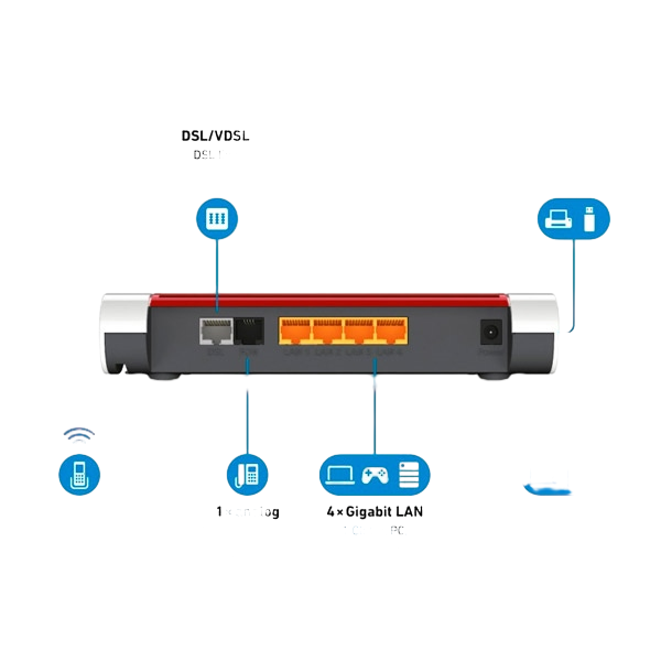El FRITZ!Box 7530 está operativo de fábrica para funcionar en su conexión de Supervectoring. Además, ofrece WiFi AC de alta velocidad y WiFi N en modo dual. El propio router también incluye cuatro puertos LAN Gigabit y un puerto USB que le permitirán, no solo integrar con facilidad todos sus dispositivos en la red doméstica, sino también vincular su impresora y un dispositivo de almacenamiento USB. De este modo, podrá disfrutar de sus archivos de vídeo, imagen y música cuando y donde usted desee.