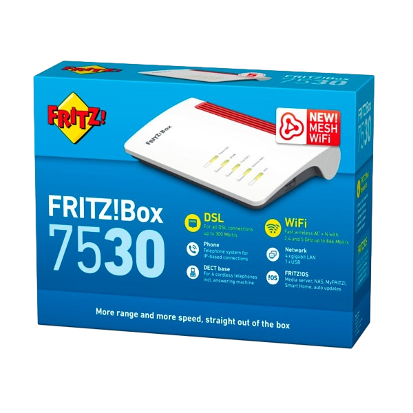 El FRITZ!Box 7530 le ofrece el acceso ideal a una red doméstica rápida con Supervectoring 35b. Además de incluir un módem ADSL/VDSL y un router WiFi en un solo dispositivo, el FRITZ!Box 7530 dispone, además, de una centralita telefónica DECT, Gigabit Ethernet, puerto USB y servidor multimedia.