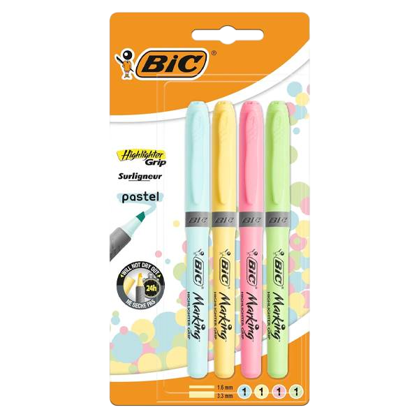 Bic Highlighter Grip Pack de 4 Marcadores Fluorescente Pastel – Tinta con Base de Agua – Punta Biselada – Trazo entre 1.60 y 3.30mm – Colores Surtidos