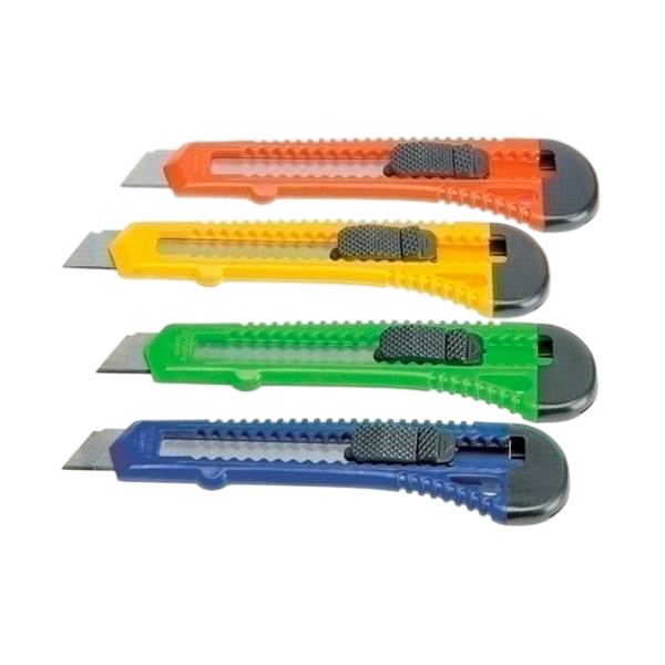Cortador de plástico con cuchilla de acero. Sistema de bloqueo, retractable e intercambiable. Cutter oficina plástico Bismark ancho 18mm. – Producto: Cutter de plástico ancho- Colores: Surtidos- Grosor: 18mm