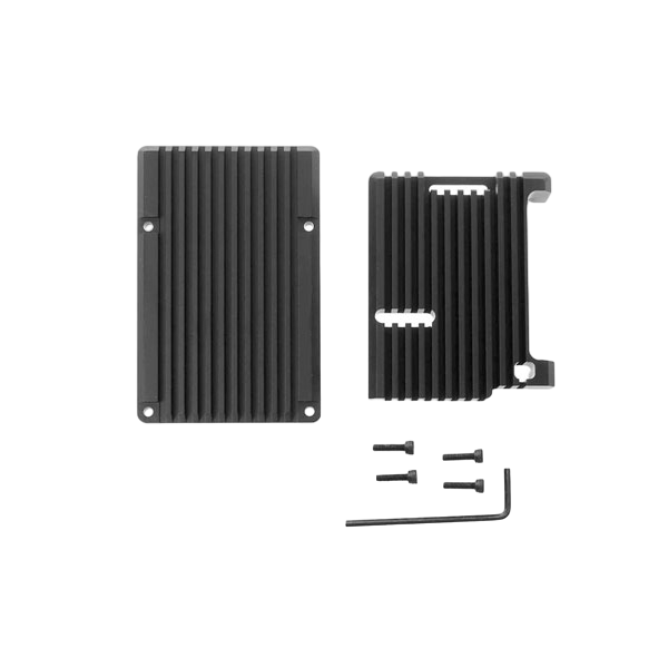 Carcasa de aleación de aluminio superior e inferior en color negro para refrigeración pasiva de la Raspberry Pi 4 modelo B. Incluye pads térmicos para transferencia de calor al disipador. Tamaño: 8,5×5,5×2,5 cm.