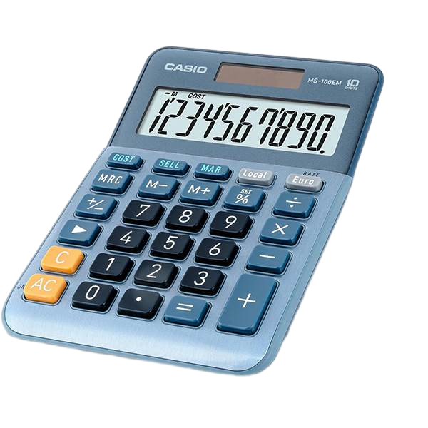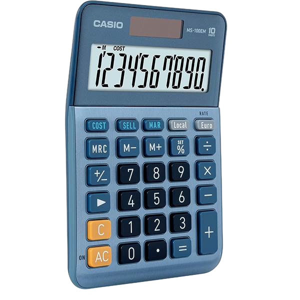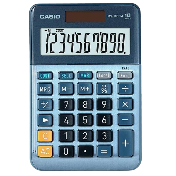 La calculadora Casio MS-100EM es una calculadora de escritorio perfecta para cualquier entorno profesional o de estudio. Con una pantalla líquida LCD de 10 dígitos, está preparada incluso para operaciones como conversión de divisa y mostrar marcadores de coma de 3 dígitos. Su diseño de placa frontal metálica de color azul le da un toque moderno a tu espacio de trabajo.