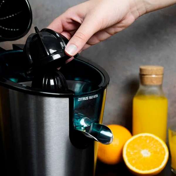 El exprimidor eléctrico de brazo Zitrus 160 Vita Inox con diseño elegante destacará en tu cocina. Gracias a sus 160 W de potencia podrás extraer todo el jugo de los cítricos en tan solo unos segundos. Benefíciate de los mejores zumos naturales. Dispone de un filtro de acero inoxidable de alta calidad que consigue resultados fantásticos. Diseñado para adaptarse a las necesidades de cada momento. Zitrus 160 Vita Inox hace zumos perfectos, cuenta con dos conos desmontables que te permiten exprimir cítricos de mayor o menor tamaño. La palanca de presión destaca por su ergonomía, no tendrás que esforzarte al exprimir los cítricos. Evitarás mancharte las manos, ya que no tendrás que estar en contacto directo con la fruta. En cuanto detecta presión sobre el cono, se inicia automáticamente, sin necesidad de botones adicionales. Consigue zumos ricos en azúcares naturales y minerales. Su sistema de extracción continua evita que se pierdan las vitaminas, ya que el zumo se irá vertiendo a tu vaso directamente durante el exprimido. Su sistema antigoteo te permitirá cambiar de vaso cómodamente mientras preparas zumo. Para activar la salida de zumo simplemente tendrás que realizar un ligero movimiento hacia abajo de la lengüeta y, para frenar la salida de zumo tendrás que mover la lengüeta hacia arriba. Nunca más volverás a manchar la encimera con restos de zumo.