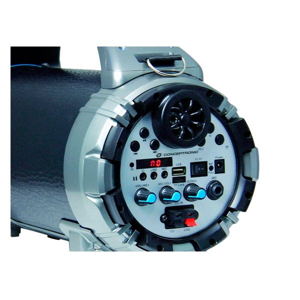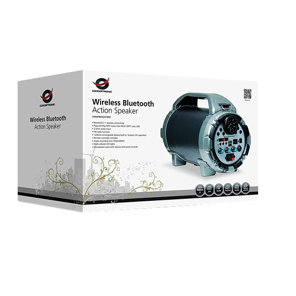 El Conceptronic Altavoz de acción inalámbrico es un altavoz multimedia Bluetooth que se conecta de forma inalámbrica a un teléfono móvil Bluetooth, unidad PDA, equipo portátil o PC. Se trata de un altavoz de alta sensibilidad con circuito magnético ultragrande con alta potencia de penetración, impacto de baja frecuencia y representación perfecta de frecuencias medias y altas. Admite entrada de micrófono y grabación de entrada de micrófono, lo que le permite actuar como ayudante personal tanto para uso en fiestas como profesional. El altavoz también graba su radio de FM favorita o la fuente de sonido auxiliar. Suficientemente ligero para transportarse fácilmente con la correa para el hombro incluida, es el compañero perfecto para actividades al aire libre como barbacoas, acampadas, comidas campestres o la playa.