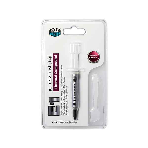 Pasta térmica Cooler Master IC Essential E1: Alta conductividad térmica, Resistencia térmica baja, Eléctricamente no conductor, No curado, No capacitivo, No corrosivo, Limpiador de grasa incluido para limpiar fácilmente la grasa térmica vieja.