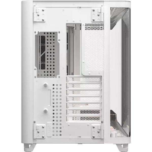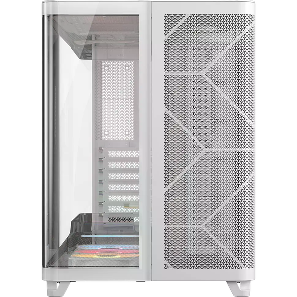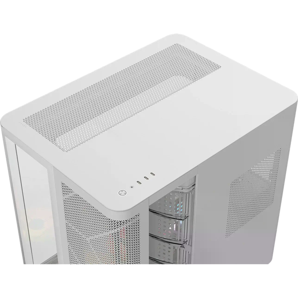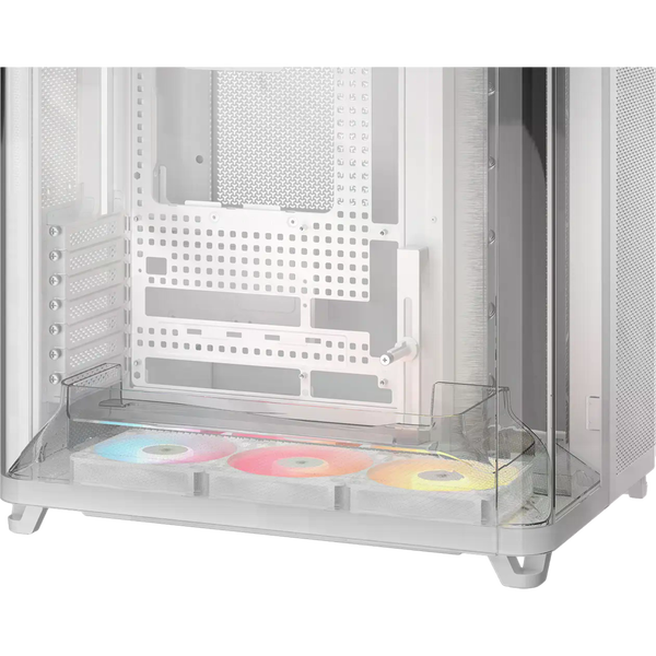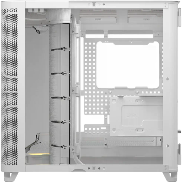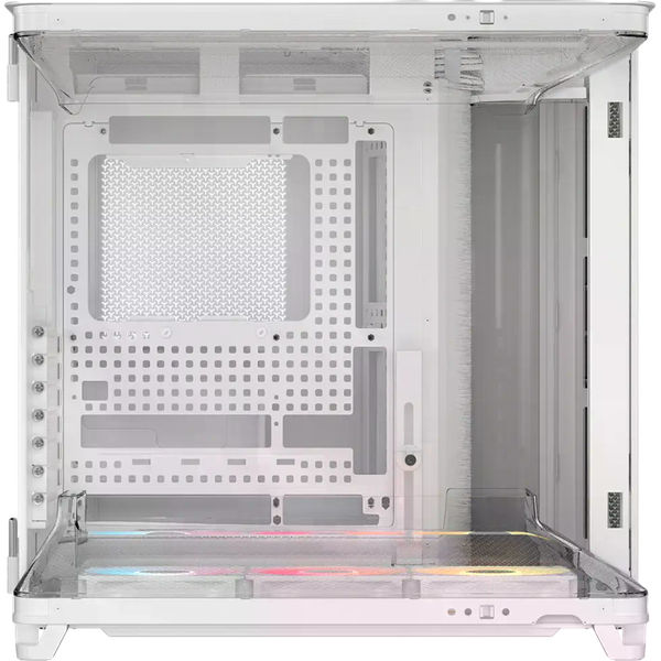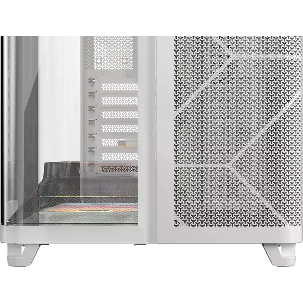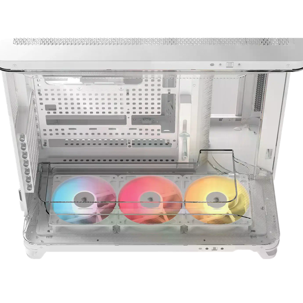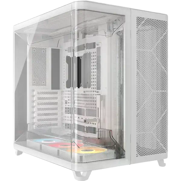 La Corsair AIR 5400 RS-R ARGB es una caja semitorre diseñada para quienes buscan un chasis moderno con una refrigeración eficiente y una estética cuidada. La estructura en color blanco con paneles de cristal templado permite mostrar claramente los componentes del equipo, mientras que su diseño interior optimizado facilita montar configuraciones potentes con un aspecto limpio y ordenado. Es una opción pensada tanto para equipos gaming como para configuraciones de alto rendimiento. Uno de sus aspectos más destacados es el diseño de triple cámara, que separa los principales componentes del sistema para mejorar la gestión térmica. La caja dispone de compartimentos independientes para la CPU, la zona de GPU y placa base, y la fuente de alimentación junto con el almacenamiento y el cableado. Esta distribución permite optimizar el flujo de aire y facilita el montaje, manteniendo cada zona del equipo mejor organizada y refrigerada.