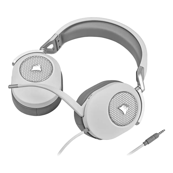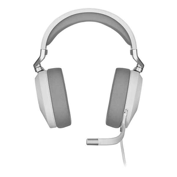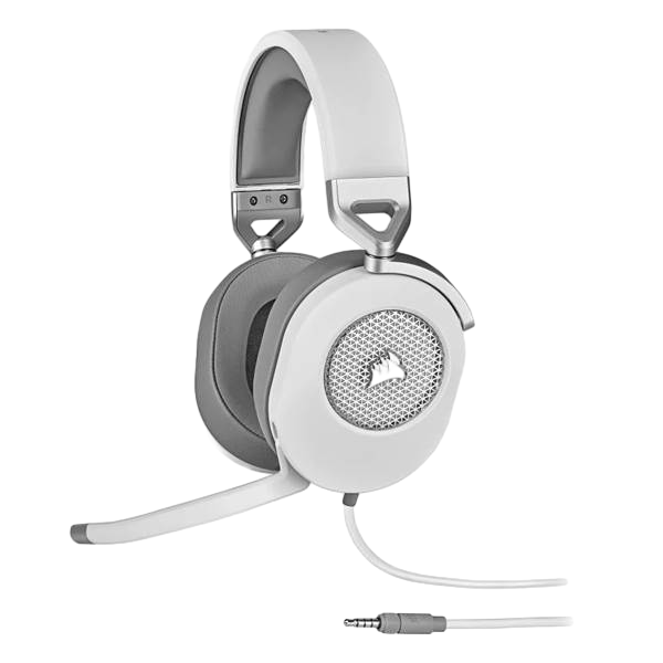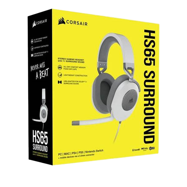 Los Corsair HS65 Surround White son unos auriculares para juegos de alta calidad diseñados para ofrecer una experiencia de audio envolvente y cómoda durante largas sesiones de juego. Estos auriculares tienen un elegante diseño en color blanco con detalles en negro y plateado, lo que los hace atractivos a la vista.