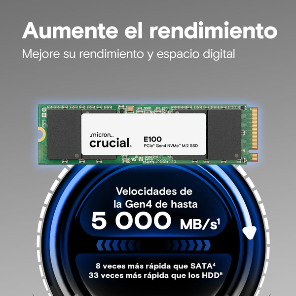 El Crucial E100 480GB es un SSD de última generación que utiliza la interfaz PCIe 4.0 NVMe para ofrecer un rendimiento superior en comparación con las generaciones anteriores. Con una capacidad de 480GB, es perfecto para usuarios que necesitan un almacenamiento rápido y confiable.
