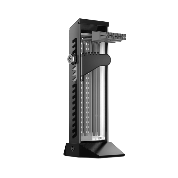Soporte para tarjeta GPU que además de aguantar su peso, especialmente en los modelos de gama alta, permite pasar los cables para alimentarla y añade iluminación RGB.