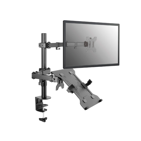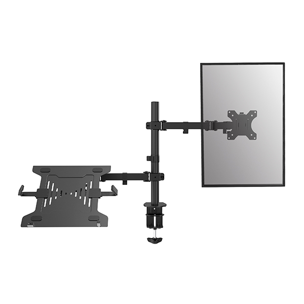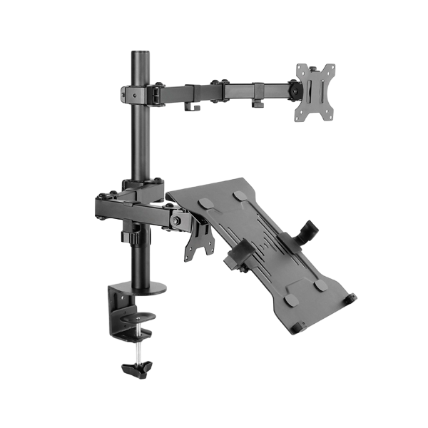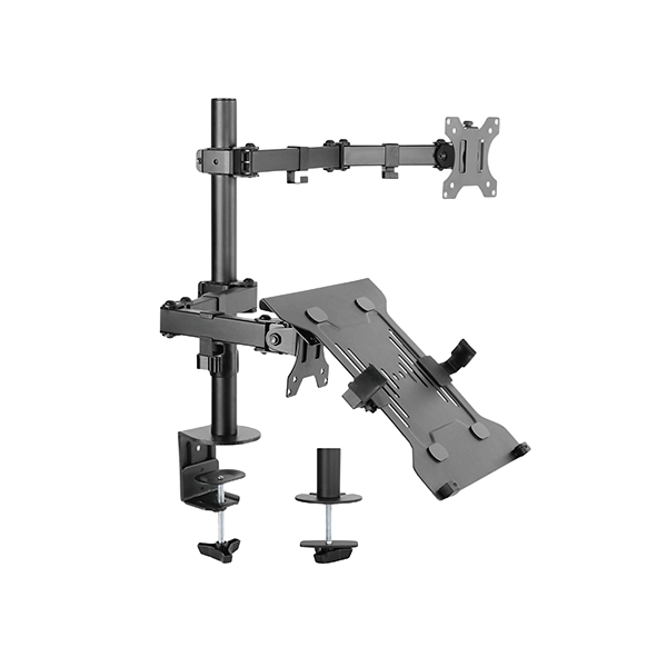 El soporte de monitor + soporte de portátil de Equip es un producto compacto pero resistente que garantiza una instalación confiable de su monitor LCD / LED. Opción de montaje: abrazadera / arandela. Rotación de pantalla: 360°. Max. VESA: 100×100. Max. Capacidad de carga: 9 kg. Construcción de aluminio resistente y ligera. La estructura de resorte de gas ofrece una presentación perfecta de contrapeso en todas las direcciones. El medidor de tensión de resorte incorporado se puede ajustar fácilmente para adaptarse a diferentes pesos en el brazo. Cumple con los estándares VESA. Ajuste de altura sin herramientas. Sistema integrado de gestión de cables. Anchura de base para portátil Max. 420mm – Min. 240mm.