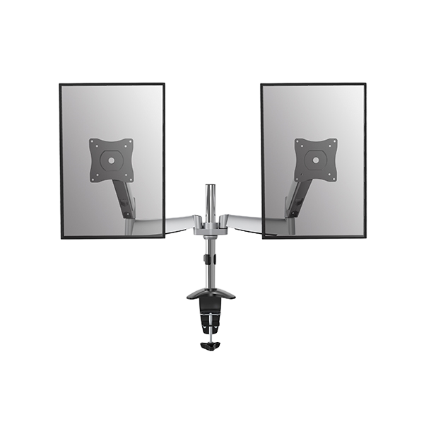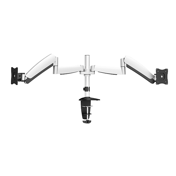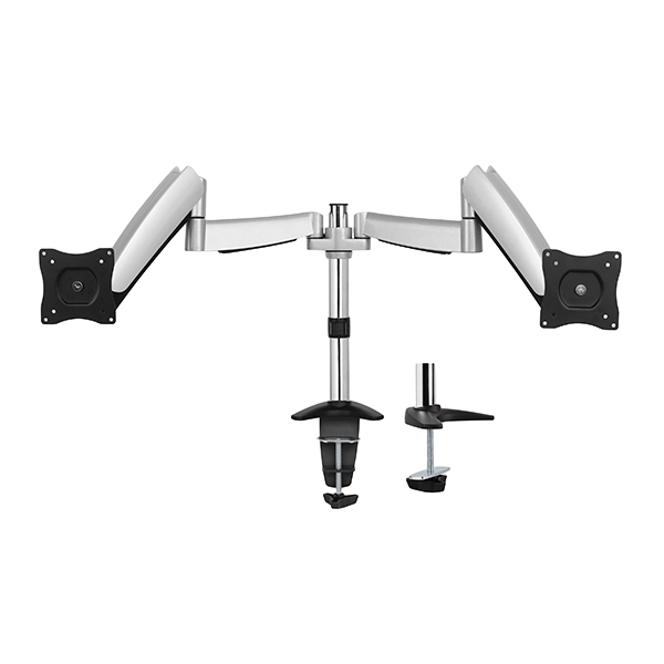 Soporte de pantalla articulado para mesa con dos brazos para dos pantallas de entre 13" y 27". Brazo hidraulico inclinable y giratório 360 grados. Compatibilidad VESA 100. Capacidad de hasta 9 kilos. Construido en aluminio resistente y ligero.