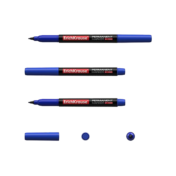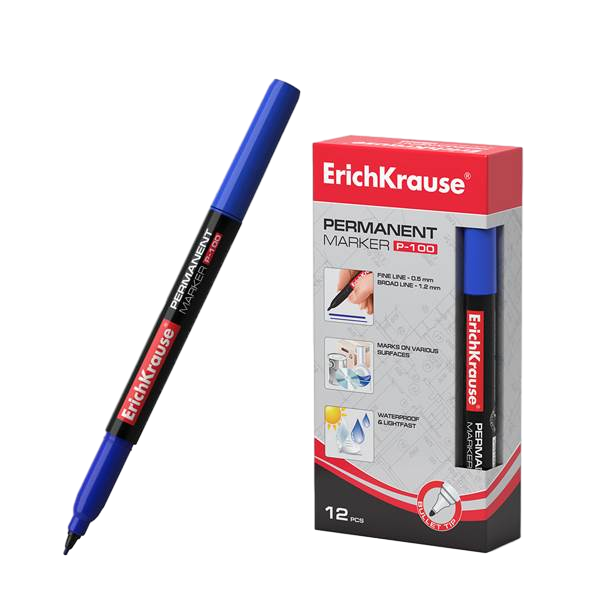 Marcador permanente fino universal. Disenado para escribir y marcar en casi todas las superficies: papel, carton, vidrio, plastico, porcelana, ceramica, madera, etc. Tiene el cuerpo de forma redonda y tapa con clip del color de la tinta. La punta en forma de bala es resistente al dano y la abrasion. El ancho de escritura es de 0.5 a 1.2 mm. Las tintas a base de alcohol son resistentes al agua, la luz, los rayos UV y se secan rapidamente despues de su aplicacion. No son toxicas. No contienen xileno.
