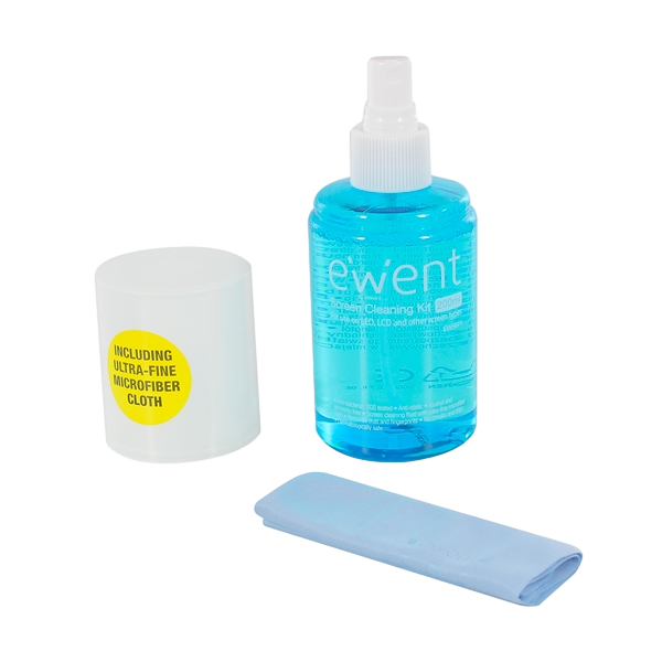 El juego de limpieza para pantallas de Ewent EW5671 mantiene limpios sus valiosos equipos. Este juego asegura una limpieza fácil y completa de las pantallas de ordenador y de otros periféricos. El polvo y las huellas se eliminan con facilidad. El compuesto limpiador está hecho con una fórmula especial SGS antibacteriana y ha sido sometido a pruebas. El paño de microfibras ultrafinas no deja rastros ni gotea. La fórmula no contiene alcohol ni amoniaco, es dermatológicamente segura y es antiestático.