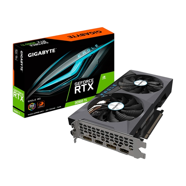 Gigabyte GeForce RTX3060 Ti Eagle 8GB GDDR6 – Tarjeta Gráfica Nvidia GeForce RTX 30 Serie. Core Clock 1665 MHz, CUDA Cores 4864, Memory Clock 14000 MHz, Memory Size 8 GB, Memory Type GDDR6, Memory Bus 256 bit, Memory Bandwidth 448 GB/s, Card Bus PCI-E 4.0 x 16, Digital max resolution 7680×4320 @60Hz, Integrated with 8GB GDDR6 256-bit memory interface, WINDFORCE 2X Cooling System with alternate spinning fans, 100mm unique blade fans, RGB Fusion 2.0, Protection back plate, Multi-view 4, PCB Form ATX, DirectX 12 Ultimate, OpenGL 4.6, Output DisplayPort 1.4a x2, HDMI 2.1 x2, Recommended PSU 600W, Power Connectors 8 Pin x1, Dimensions 242mm X 124mm X 41mm.