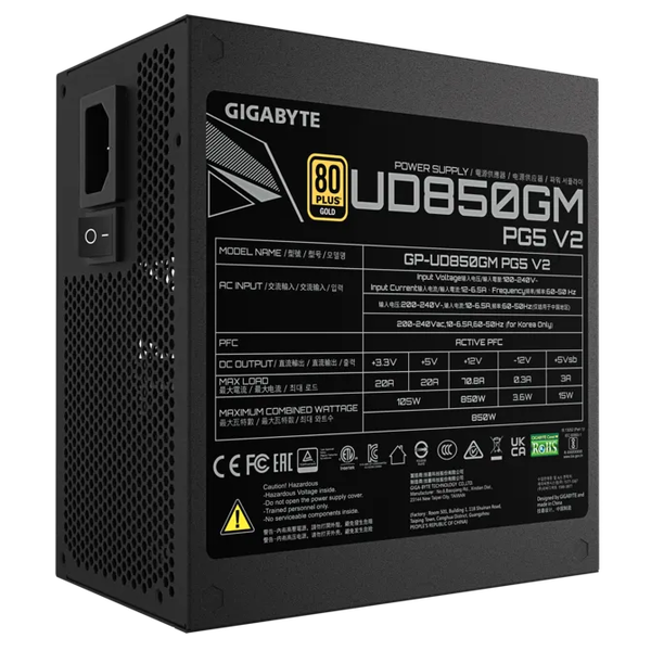 Esta fuente está preparada para el hardware más moderno gracias a su compatibilidad con Intel ATX 3.1 y PCIe Gen 5.1, suministrando energía a través de un potente riel único de +12 V. Integra un completo sistema de protecciones eléctricas OVP, OPP, SCP, UVP, OCP y OTP, que salvaguardan todos los componentes frente a sobrecargas, picos de tensión o sobrecalentamiento. Además, mantiene una señal Power Good de 100–150 ms y un tiempo de retención superior a 16 ms, asegurando estabilidad incluso ante variaciones de corriente. La GP-UD850GM PG5 V2 ofrece un conjunto de conexiones versátil para configuraciones avanzadas, incluyendo ATX 20+4 pines, CPU/EPS 4+4 pines, múltiples conectores PCIe 6+2 y un conector PCIe 12+4 pines para tarjetas gráficas de nueva generación, además de SATA y periféricos. Todos los cables son negros y de tipo embossed, pensados para una gestión limpia y estética. Es la elección ideal para gamers, creadores y entusiastas que buscan potencia, eficiencia y seguridad en un diseño moderno y compacto.