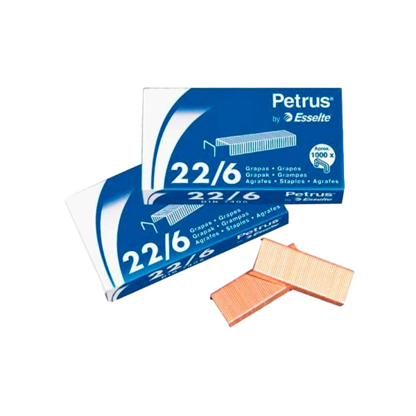 Grapas Petrus 22/6 en caja de 1000 unidades para la mayoría de grapadoras de oficina que usan 22-6 o 24-6. Adecuadas para grapar hasta 30 hojas de 80 gramos. Patillas de 6 mm.