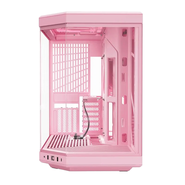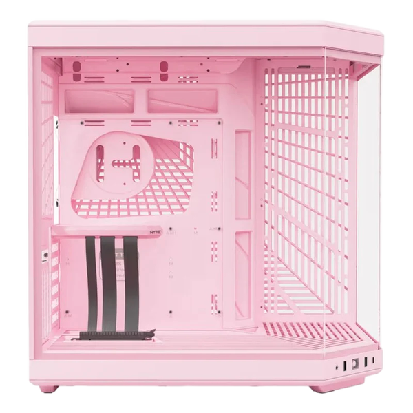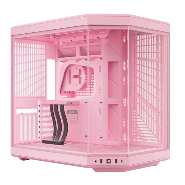La Hyte Y70 Rosa es una caja ATX de torre media con diseño de doble cámara que destaca por su estética moderna y funcionalidad avanzada. Su estructura incorpora paneles panorámicos de cristal templado en tres lados, permitiendo una visualización completa del hardware interno. Es compatible con placas base ATX, E-ATX, Micro-ATX y Mini-ITX, ofreciendo una amplia gama de opciones para diversas configuraciones. Incluye un cable riser PCIe 4.0 x16, facilitando la instalación de tarjetas gráficas en posición vertical de hasta cuatro ranuras, pudiendo acomodar GPUs de gran tamaño sin comprometer el flujo de aire.