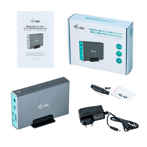 I-Tec MySafe USB-C Gen. 2 / USB 3.0 Caja de dos bahías SATA HDD / SSD de 2.5 “es una caja externa para dos unidades SATA HDD / SSD de 2.5” para conectar a su PC, notebook o tableta a través de interfaz USB-C o USB 3.0 (conectores USB-C a USB-C y USB-C a USB 3.0 incluidos). La conexión USB ofrece una transferencia de datos rápida y fácil: hasta 10 Gbps a través de USB-C y hasta 5 Gbps a través de USB 3.0. La interfaz USB-C es compatible con Thunderbolt 3. La construcción de la caja de aluminio proporciona una disipación de calor eficiente y protección HDD / SSD. Una de las principales ventajas de este caja es el soporte RAID 0 / RAID 1 / JBOD, que le permite configurar una alta protección de datos o una escritura muy rápida o crear una unidad grande que consta de dos discos.