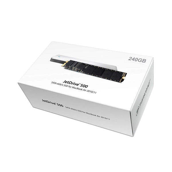 El kit de ampliación de SSD para Mac Transcend JetDrive 500 tiene todo lo necesario para que puedas ampliar el almacenamiento interno de tu Mac. Incluye destornilladores, cable USB, y una caja especial para que puedas utilizar tu viejo SSD como disco duro externo. Es compatible con los modelos MacBook Air 11" Finales 2010 – Mediados 2011 y MacBook Air 13" Finales 2010 – Mediados 2011". Alcanza velocidades de hasta 570MB/s de lectura y 460MB/s de escritura y cuenta con 240GB de capacidad de almacenamiento
