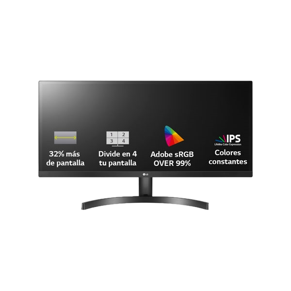 Monitor LG 29WK500-P de altas prestaciones y diseño sin bordes ultrafino. Panel A-IPS libre de parpadeos y angulo de visión de 178 grados. Tecnología de rango dinámico HDR10. Diagonal de la pantalla: 73,7 cm (29"), Pantalla tipo UltraWide 21:9 con resolución de la pantalla: 2560 x 1080 Pixeles, Tecnología de visualización: LED. Tiempo de respuesta: 5 ms, Conexiones 2x HDMI, Cobertura de color sRGB 99%. Compatible AMD FreeSync. Altavoces incorporados. montaje VESA. Color del producto: Negro.