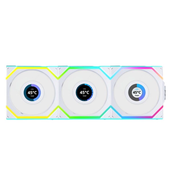 Ahora viene la parte que hace que este pack no sea “solo” un kit de ventiladores premium. Cada unidad integra una pantalla LCD IPS de 1.6” con resolución 400×400, brillo de 500 nits (típico) y color completo sRGB de 24 bits, configurable desde L-Connect 3. Puedes usarlo de forma práctica (telemetría de CPU/GPU, temperaturas, carga, RPM) o estética (imágenes y GIFs). Y para rematar, el sistema ARGB incorpora 40 LED por ventilador con dos zonas, lo que se traduce en efectos más definidos y una iluminación más uniforme cuando instalas los tres en línea.