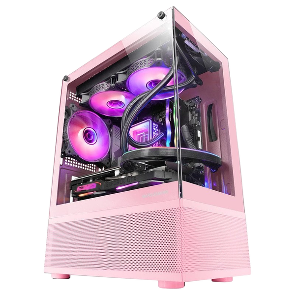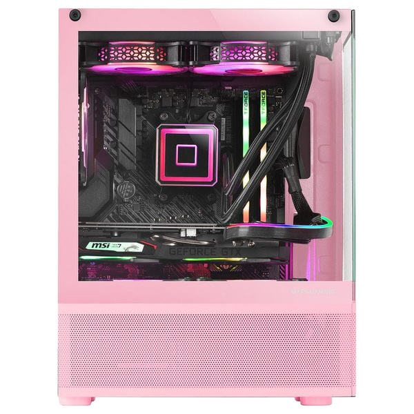 La Mars Gaming MC-SE es una caja Micro-ATX que combina un diseño moderno con características avanzadas para los entusiastas del hardware. Su estructura de cristal templado rosa no solo proporciona un aspecto atractivo, sino que también permite una vista clara de los componentes internos.