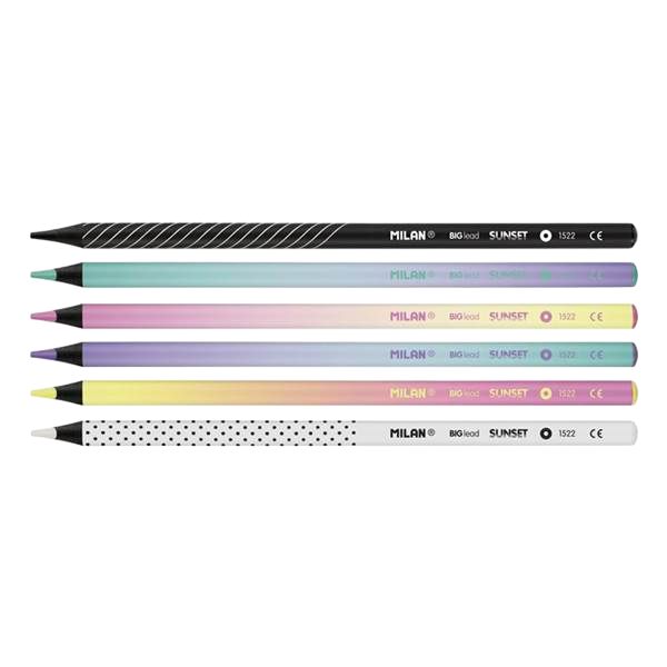 Descubre los lápices de colores Serie Sunset, Caja de 6 lápices de colores mina gruesa redondos de madera negra para un trazo impecable. Cada lápiz cuenta con una mina de 3,5 mm Ø de grosor, ideal para colorear grandes superficies. La mina ofrece un trazo uniforme, es resistente a la rotura gracia al sistema LPS (Lead Protection System) que protege la mina gracias a su adhesión con la madera lo que asegura tener una resistencia y un trazo uniforme.