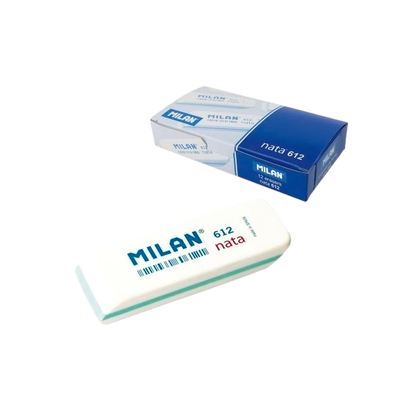 Goma "Nata" de plástico blanca, suave, versátil y no abrasiva. Para borrar sobre todo tipo de superficies. No daña el papel. Goma biselada blanca con un ribete de colores aleatorios: azul, rojo, verde.