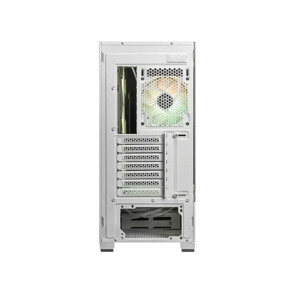El interior admite placas base ATX, micro-ATX y Mini-ITX, tarjetas gráficas de hasta 400 mm y disipadores de CPU de hasta 160 mm. Ofrece almacenamiento flexible con 2 unidades de 2.5", 2 unidades de 3.5" y 2 bandejas combinadas de 2.5"/3.5". Las 7 ranuras de expansión permiten instalar tarjetas adicionales manteniendo un interior ordenado y funcional. En conectividad, la MAG PANO 100R PZ ARGB White incluye USB Type-C 20 Gbps, puertos USB Type-A y conectores de audio en el panel frontal, así como botones de encendido y control LED para personalizar la iluminación ARGB. Esta caja combina ventilación eficaz y flexibilidad de hardware, convirtiéndose en una opción para gamers y entusiastas que buscan un setup funcional y visualmente destacado.
