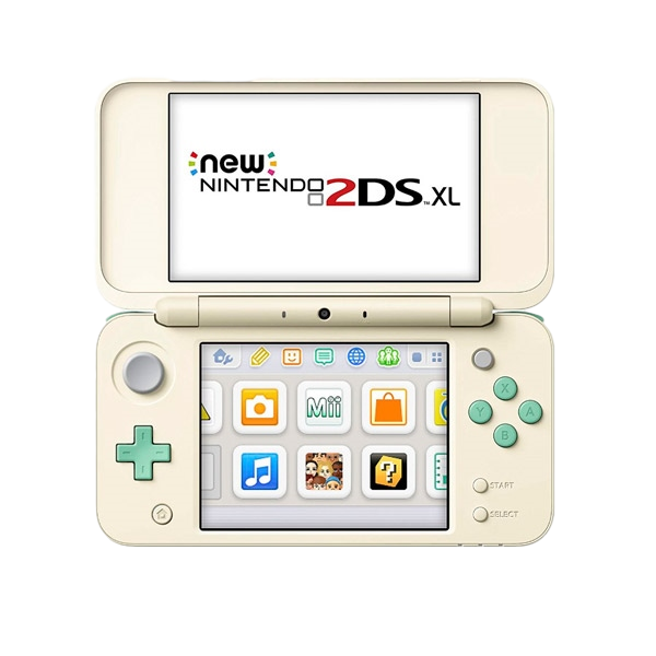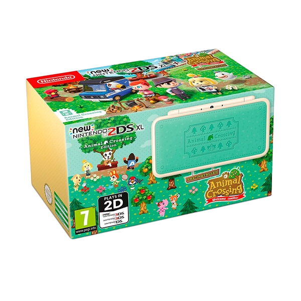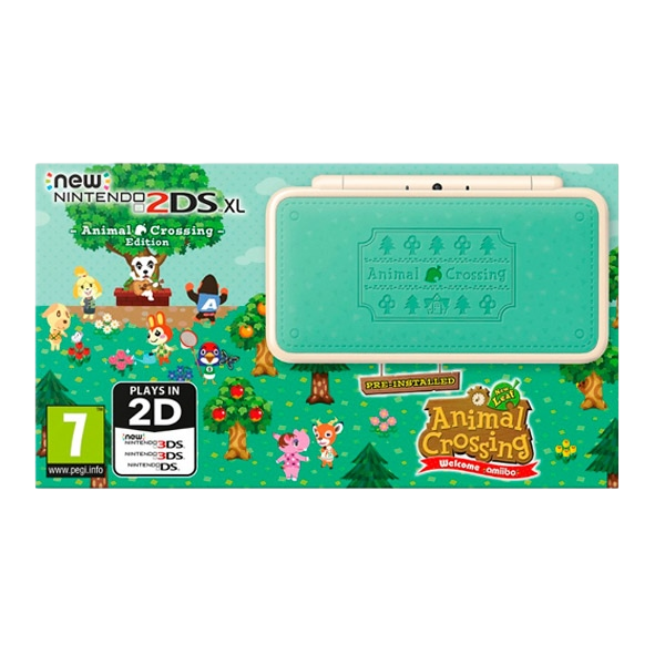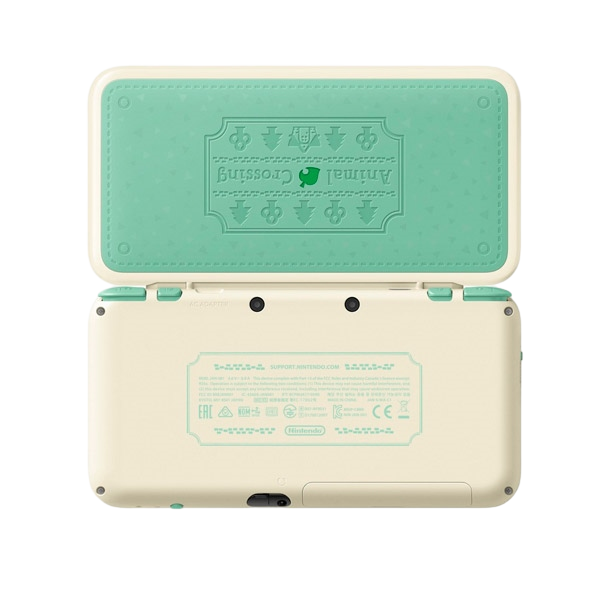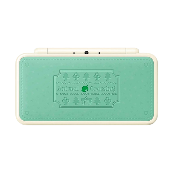 Videoconsola Nintendo 2DS XL con el juego Animal Crossing New Leaf preinstalado. Esta versión de la consola está especialmente diseñada con motivo del juego Animal crossing, y cuenta con un color verde exclusivo y con un grabado en la carcasa exterior.