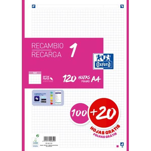 Oxford Recambio 5 Fucsia 100+20 Hojas DIN-A4 4 taladros 90g Cuadros 5x5mm