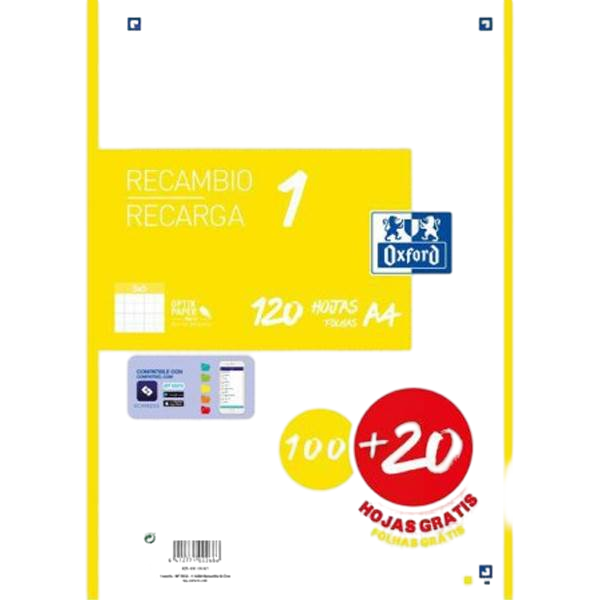 Recambio OXFORD retractilado en paquete de 100 Hojas con 1 color de banda y 4 taladros de archivo para poder guardar las hojas en un archivador o carpeta de anillas. Ideal para quienes prefieren hojas sueltas y llevar sólo las que necesiten. Compatible con la app gratuita SCRIBZEE que permite organizar, consultar, compartir y acceder a tus notas en cualquier lugar desde tu Smartphone, tablet o PC.