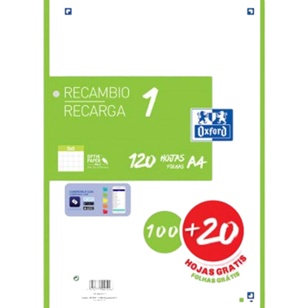 Oxford Recambio 5 Verde 100+20 Hojas DIN-A4 4 taladros 90g Cuadros 5x5mm