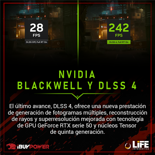 DLSS es un conjunto revolucionario de tecnologías de renderizado neuronal que utiliza IA para aumentar los FPS, reducir la latencia y mejorar la calidad de imagen. ‌El último avance, DLSS 4, ofrece una nueva prestación de generación de fotogramas múltiples, reconstrucción de rayos y superresolución mejorada, con tecnología de GPU GeForce RTX™ serie 50 y núcleos Tensor de quinta generación. La combinación de DLSS y GeForce RTX ofrece la mejor forma de jugar, respaldada por un superordenador de IA NVIDIA en la nube que mejora constantemente las capacidades de juego de tu PC.