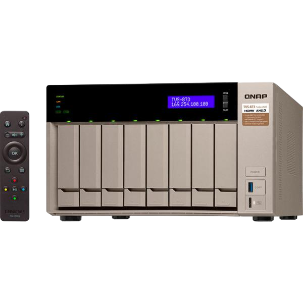 NAS profesional de 10GbE de alto rendimiento con una potente APU quad-core AMD R-Series. El TVS-873 cuenta con una unidad de procesamiento acelerado (APU) integrada AMD que combina el rendimiento excepcional de la CPU con los Gráficos R7 AMD Radeon™, proporcionando así una solución NAS con un alto rendimiento y una alta eficiencia energética. Construido con un vanguardista diseño metálico y rematado con un elegante acabado dorado, el TVS-873 cuenta con una potente CPU de cuatro núcleos, motor de cifrado de hardware AES-NI, hasta 64 GB de RAM, USB 3.1 (10Gbps) y capacidad de ampliación a 10GbE con un rendimiento excepcional. Junto con el increíble USB QuickAccess, la salida HDMI 4K y la aceleración de decodificación y codificación de vídeo en 4K H.264, el TVS-873 que se ejecuta en el nuevo sistema operativo QTS 4.3 de 64 bits proporciona una óptima experiencia audiovisual y un sistema de nube privada completo.