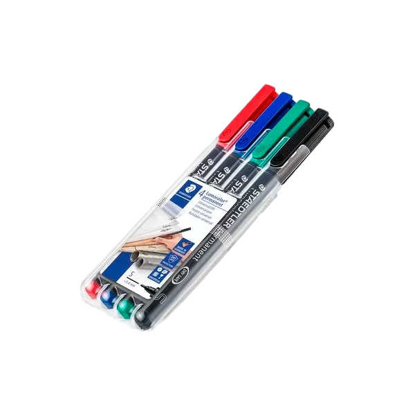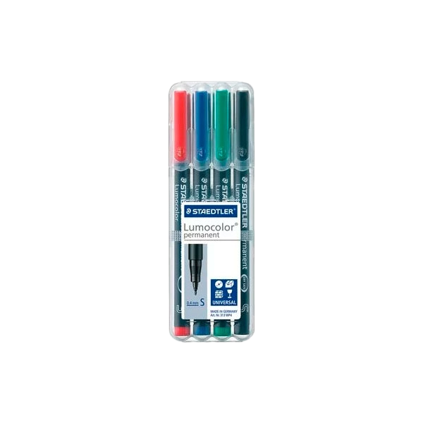 Estuche 4 Rotuladores universales permanentes Staedtler Lumocolor permanent pen 313 – Colores Negro, Verde, Azul Rojo – Ancho de línea S, aprox. 0.4 mm – Recargable – Rotulador universal para casi todas las superficies – Adecuado para retroproyección – No emborrona y es resistente al agua sobre casi todas las superficies – Seca en segundos, ideal para usuarios zurdos- Permanente, inodoro – Colores resistentes a la luminosidad: negro, marrón – Color negro resistente a la intemperie- Estuche de sobremesa STAEDTLER box – El cuerpo y el capuchón en PP garantizan una larga vida del producto – DRY SAFE – puede permanecer destapado durante días sin secarse (Test ISO 554) – Airplane safe – equilibrio automático de la presión de la tinta para evitar pérdidas durante el vuelo – Colores brillantes e intensos.