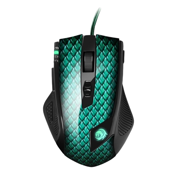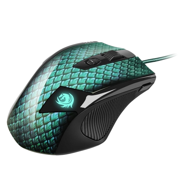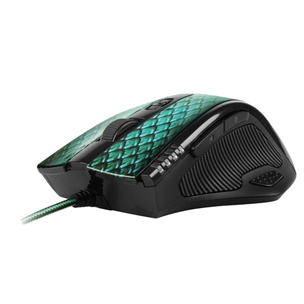 El Drakonia es un ratón láser con once botones y una rueda de desplazamiento de cuatro direcciones. Todo es libremente programable a través del software de configuración incluido. Bajo la brillante y pulida superficie del dragón opera un sensor láser Avago 9500 que soporta hasta 5.000 DPI. Un indicador LED muestra continuamente el ajuste DPI en uso actual. En la base, dentro del compartimento del láser del ratón puedes encontrar un sistema de ajuste de peso para todo el conjunto.