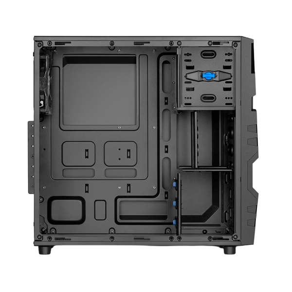 La Sharkoon VG5-W, en la llamativa versión de Windows, impresiona no sólo por su larga ventana lateral acrílica. Gracias a su musculoso diseño en el panel frontal y a las cuatro versiones diferentes de color en rojo, azul, verde y negro, con ventiladores LED de 120 mm a juego, la caja ATX es definitivamente muy llamativa.