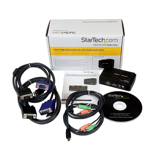 El Kit de Conmutador KVM de 2 puertos USB con Audio y Cables, SV211KUSB permite al usuario controlar dos ordenadores con USB utilizando un único teclado, ratón y monitor VGA y ofrece una operación mediante teclas de acceso rápido (hotkeys) y botones pulsadores en el panel superior facilitando la conmutación entre los ordenadores conectados.