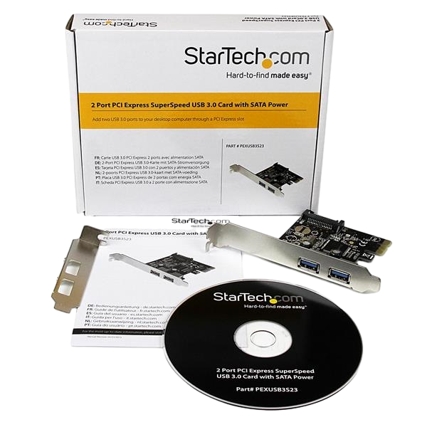 La tarjeta PCI Express USB 3.0 de 2 puertos, modelo PEXUSB3S23, permite agregar dos puertos USB 3.0 a un sistema de PC equipado con PCI Express. La tarjeta USB requiere alimentación SATA para tener funcionalidad, y ofrece 900 mA de alimentación por puerto a dispositivos USB 3.0 conectados (500 mA para USB 2.0), haciendo uso del conector SATA de la fuente de alimentación de su ordenador.