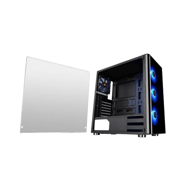 El V200 presenta un panel de vidrio templado de 4 mm de longitud completa en el lado izquierdo, que se sujeta con tornillos en cada esquina.