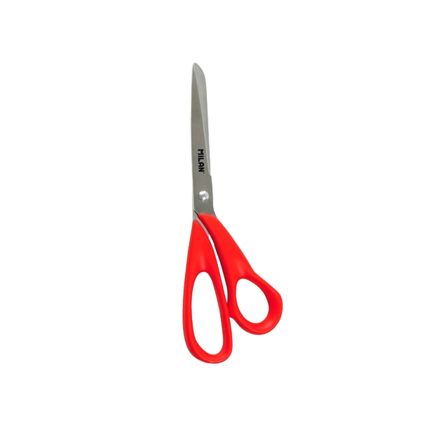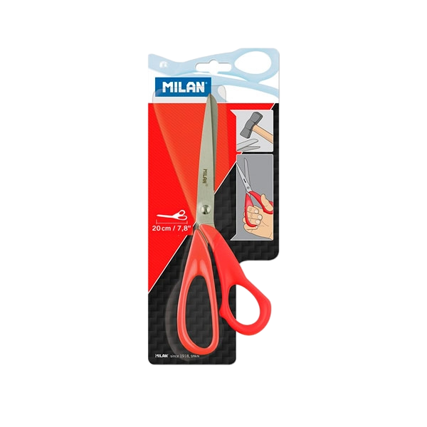 Tijeras de oficina con cuchilla de acero inoxidable. Mango de plástico rojo resistente a los golpes. 20 cm.